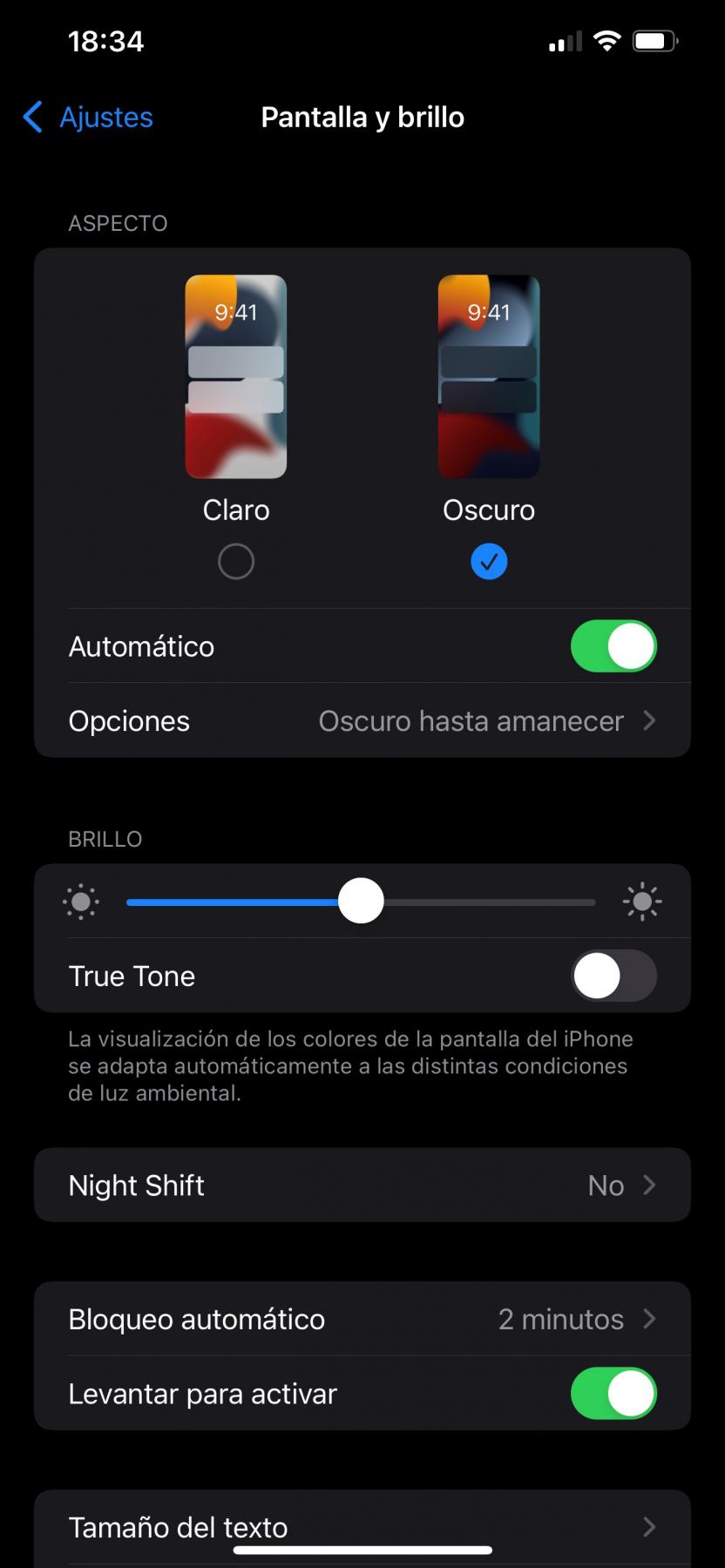 Yo lo tengo configurado el modo oscuro en IOS 15 de forma automática, depende de la hora del día, de si es de noche o de día te activa el modo oscuro y modo claro. Así no tienes que preocuparte y por la noche al irme a la cama que siempre estoy un ratejo con el móvil, pues estás usando el modo oscuro, es decir menos brillo en el menú, menos dolor para tus ojos. En este sentido, el de cuidar a tus ojos, te recomiendo actives el True Tone, algo que puedes hacer también desde "Pantalla y brillo"
