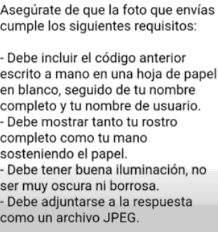 Recibirás un correo con un código y te pedirán que envíes un foto y realices lo siguiente.