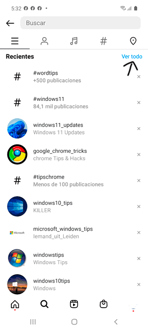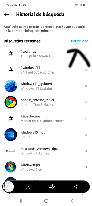 - Podrás borrar las búsquedas que no quieres que aparezcan pulsando la X o dar a historial de búsqueda instagram