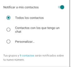 Se eliges que si que quieres que sea notificados de este este cambio, tendrás también que decidir si solo quieres que les llegue a los contactos que tienes registrados en tu agenda, o a todos los que tienes en lo chats.