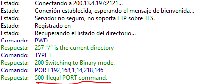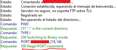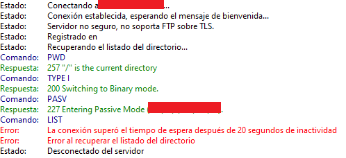Luego de que lanza ese error, FileZilla vuelve a intentar conectarse en modo pasivo, pero sigue dando el mismo error de la primera imagen. También intenté ingresar como cliente sin encriptación (ftp plano) pero no resultó, lo que me lleva a pensar que es una falla del servidor.