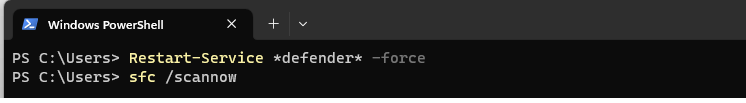 Este comando reinicia todos los servicios que tienen "defender" en su nombre, lo que debería incluir a Windows Defender. Si todavía tienes problemas, puedes probar con los siguientes comandos para verificar y reparar los archivos de sistema de Windows:
