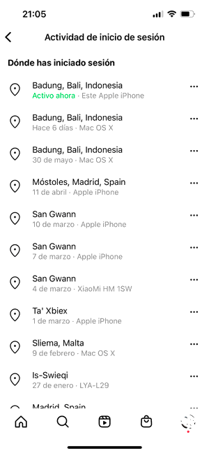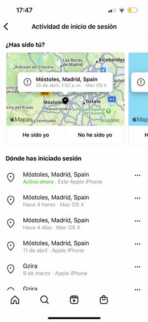 Lo que comentas de Instagram también vas a poder ver desde donde se ha iniciado sesión pero claro, esto no quiere decir que tu teléfono esté ahí ya que se registra donde se ha iniciado sesión en un momento determinado.