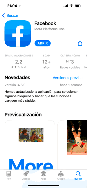 Otra cosa que debes hacer es mirar si hay actualizaciones disponibles para Facebook. Si llevas así dos años, es posible que esto tampoco lo solucione pero comprueba esto por si acaso. También puedes probar a desinstalar e instalar la app de nuevo a ver si ase se hace un reset completo y funciona de nuevo.
