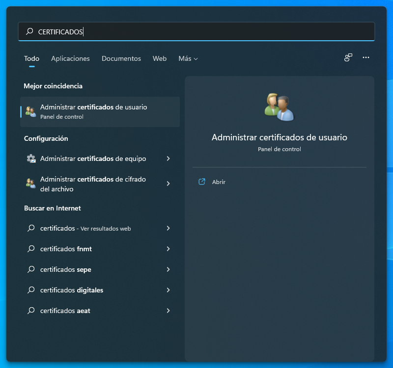 Hola FeIML, lo de gestionar certificados en Windows 11, lo que viene siendo el administrador de certificados, lo tienes siguiendo estos pasos: