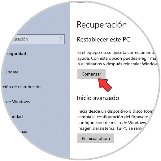 Allí vamos a “Actualización y seguridad - Recuperación":