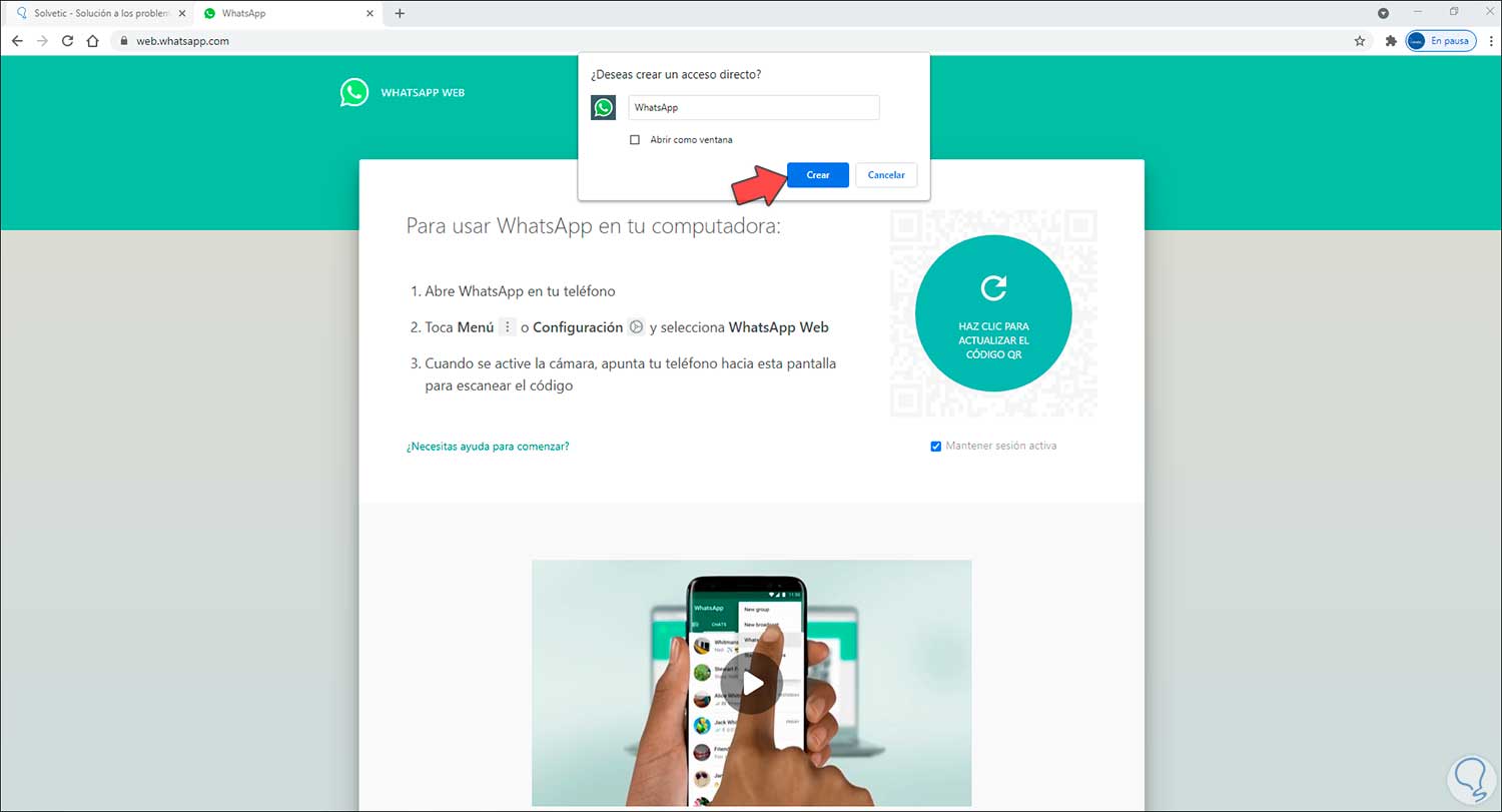 Esto creará el acceso directo en la barra de tareas y al dar clic sobre él se abrirá WhatsApp Web: