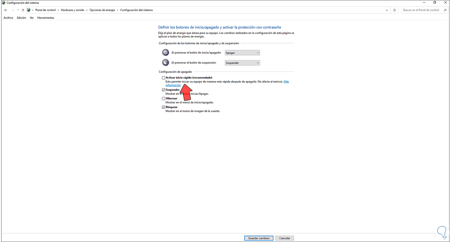 Desactivamos la casilla "Activar inicio rápido":