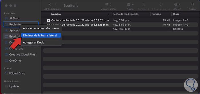 Después de esto, damos clic derecho sobre "Recientes" y seleccionamos la opción "Eliminar de la barra lateral":