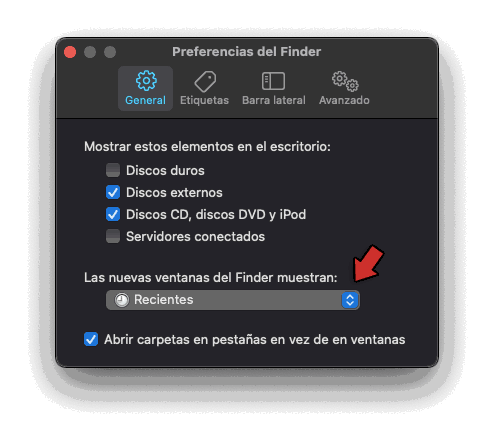 En la ventana de Preferencias del Finder, en la pestaña General, vamos a la sección "Las nuevas ventanas del Finder muestran":