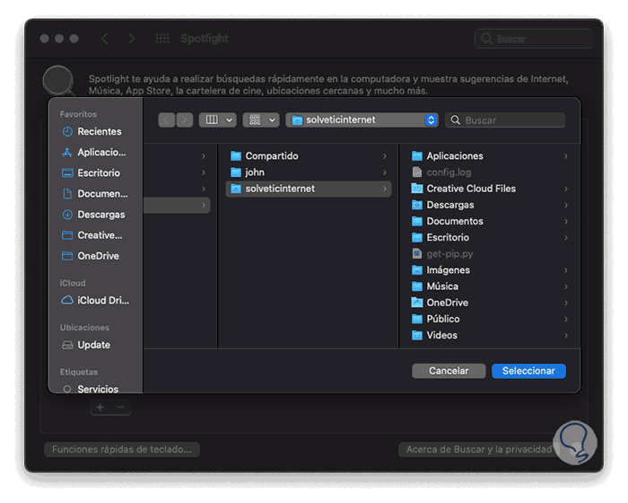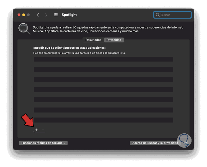 Seleccionamos Spotlight y en la pestaña "Privacidad" damos clic en el signo + ubicado en la parte inferior: