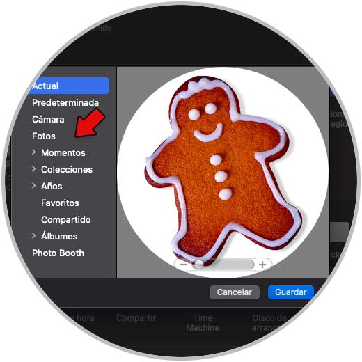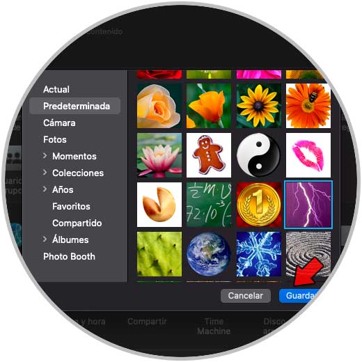 Allí es posible hacer uso de las imágenes integradas en macOS en la sección “Predeterminada” o bien usar fotos personales en “Fotos” o tomar nuestra propia foto en “Cámara”, seleccionamos la imagen deseada y damos clic en Guardar: