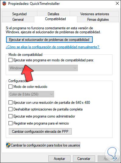 En la ventana emergente vamos a la pestaña "Compatibilidad" donde veremos lo siguiente: