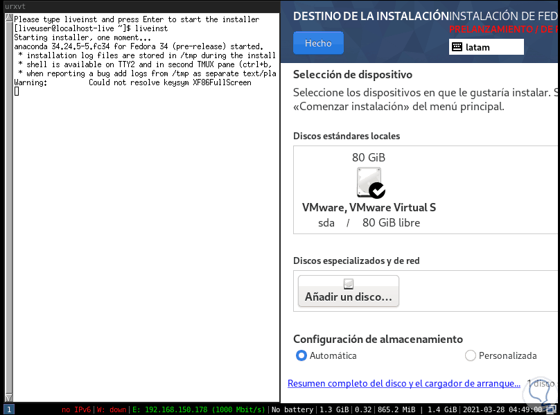 Se creará una nueva ventana donde completamos el proceso de instalación de Fedora 34 i3: