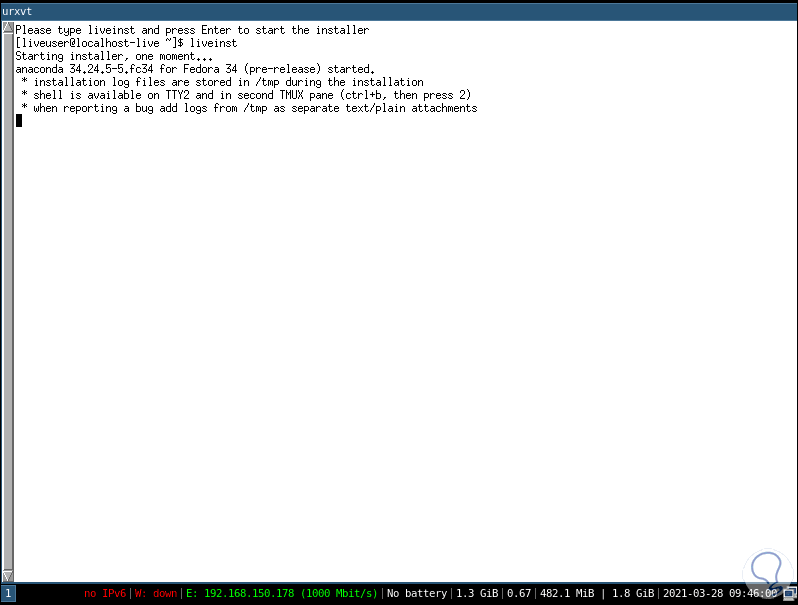 Podemos ver el mensaje por defecto para la instalación del entorno, instalamos el entono i3 ejecutando "liveinst":