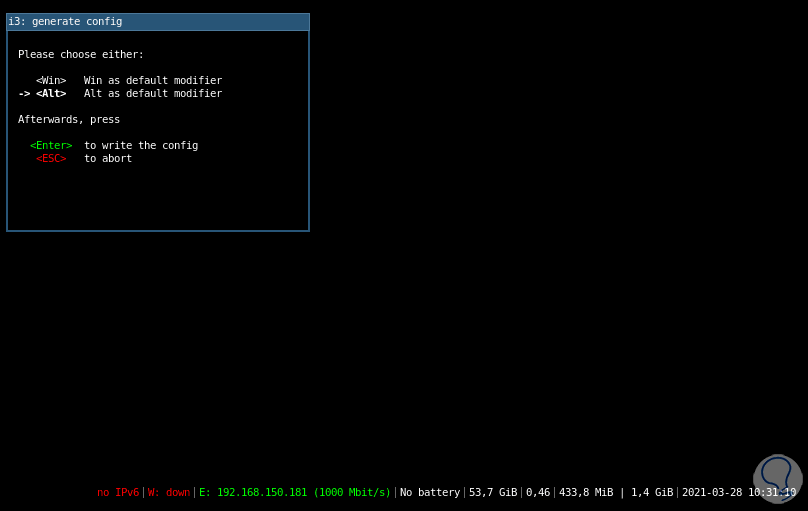 Allí pulsamos Enter para crear el archivo de configuración y luego seleccionamos el método mod (Windows o Alt):