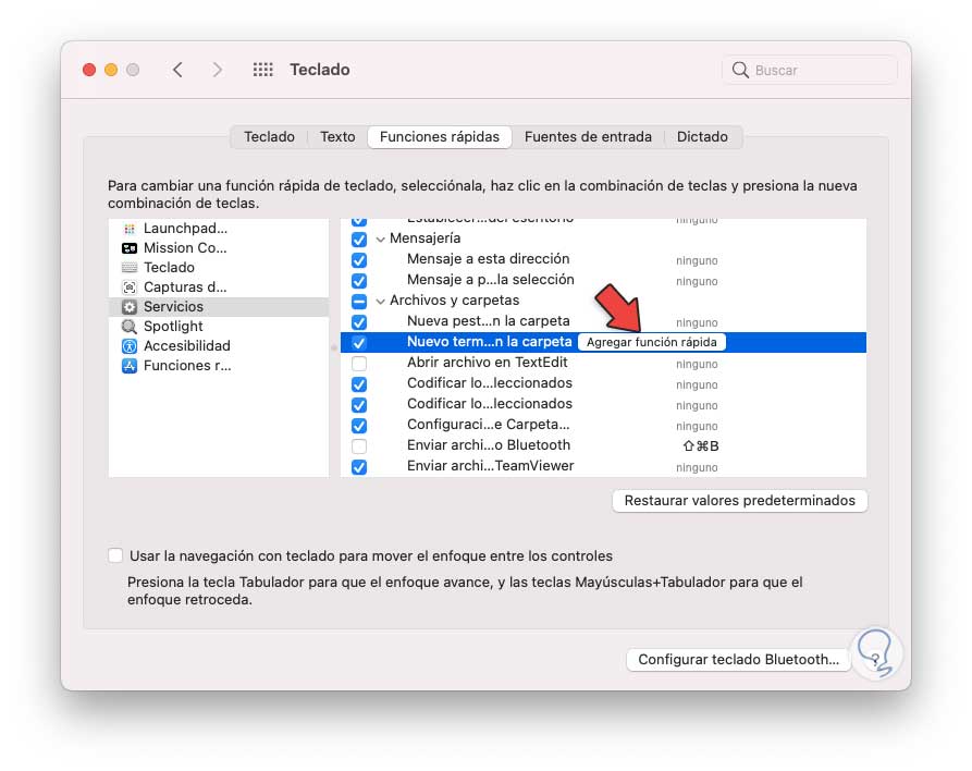 A continuación vamos a la pestaña "Funciones rápidas" y en la sección "Servicios" validamos que "Nuevo terminal en la carpeta" esté activo: