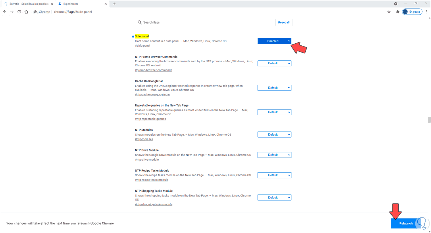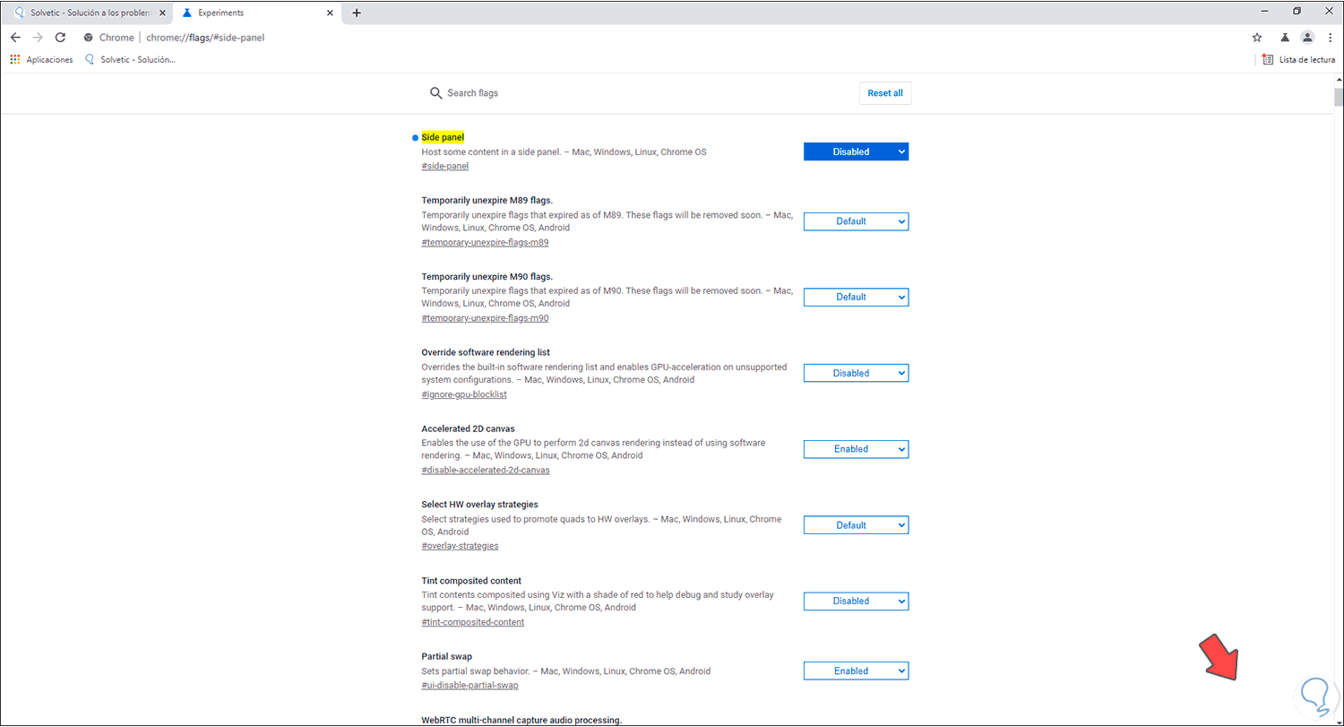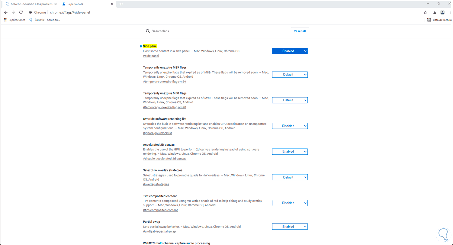 Abrimos Google Chrome, en una nueva pestaña ingresamos "chrome://flags/#side-panel":
