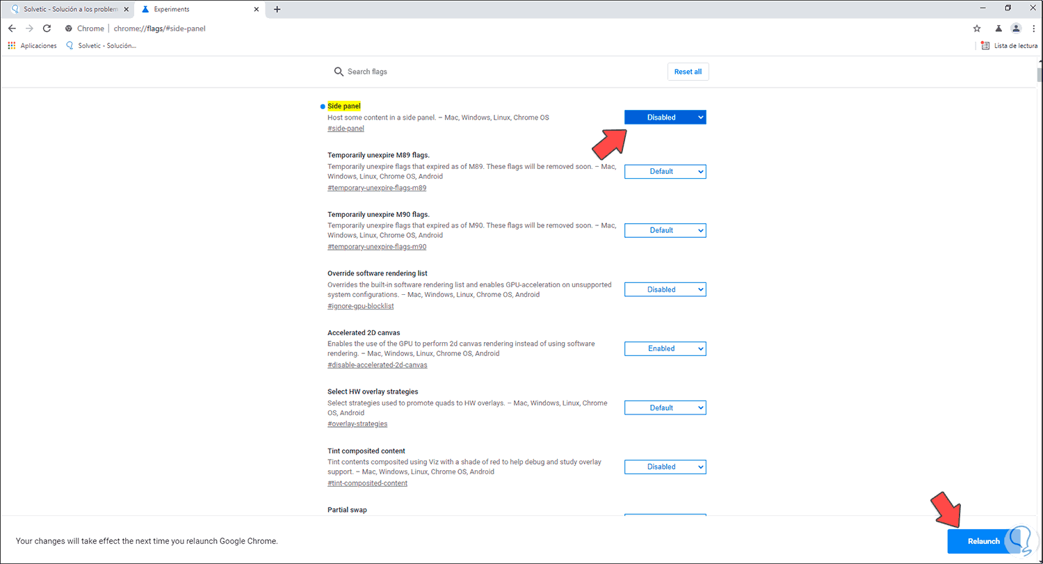 Damos clic en "Relaunch" para reiniciar Google Chrome: