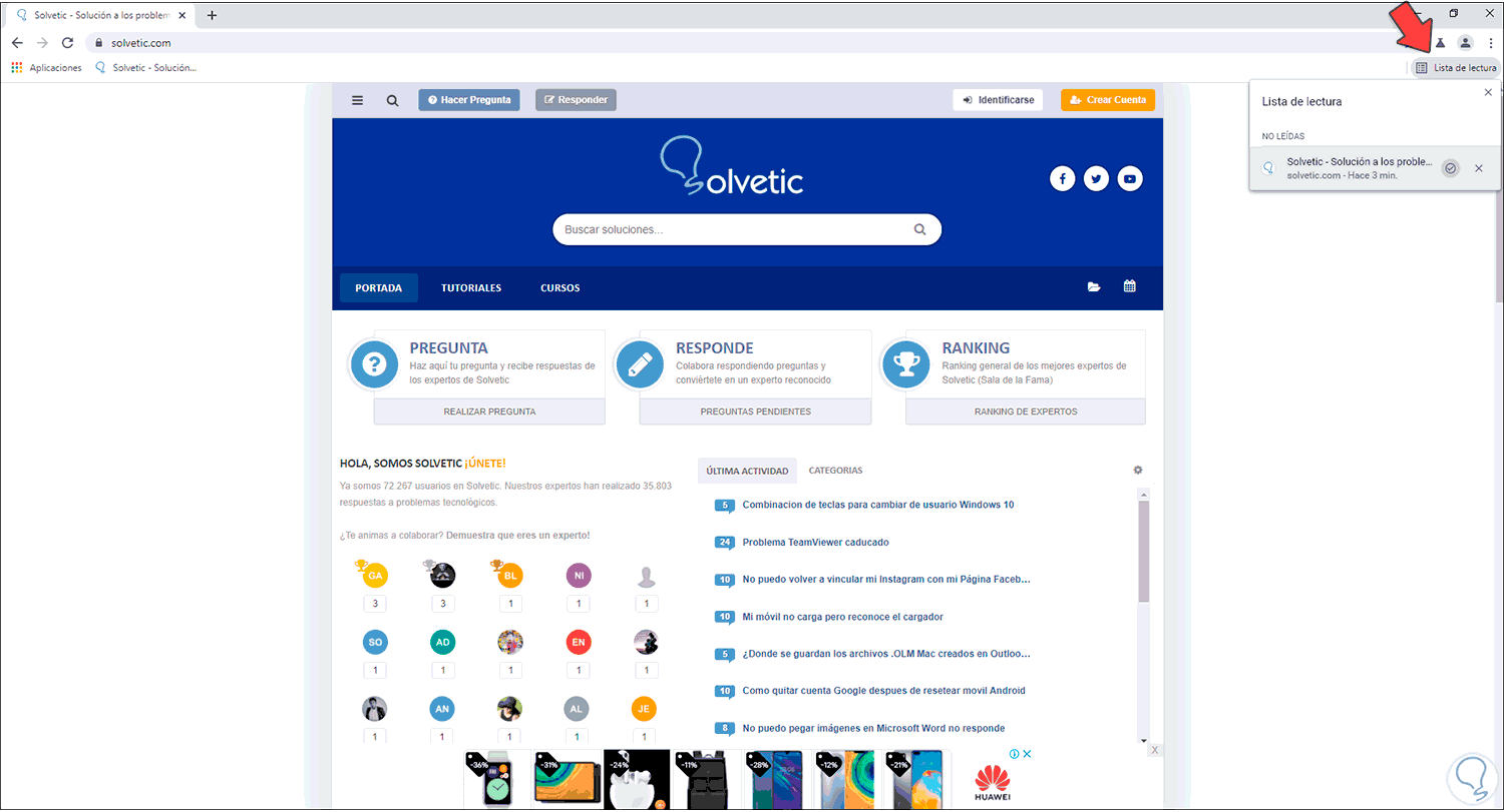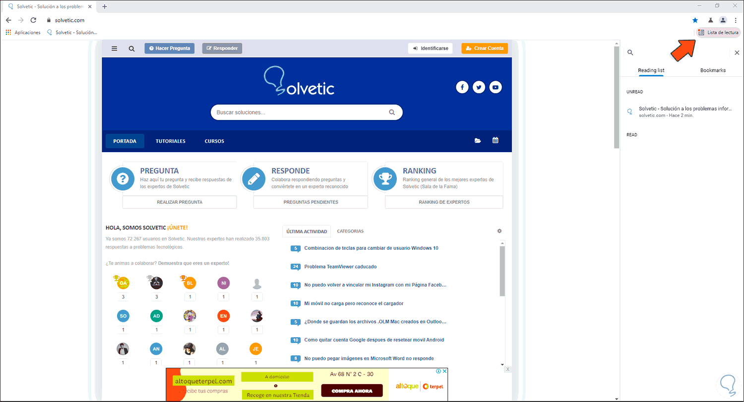 En un sitio web da clic en "Lista de lectura" para comprobar que no abre el panel lateral sino la forma estándar de lectura: