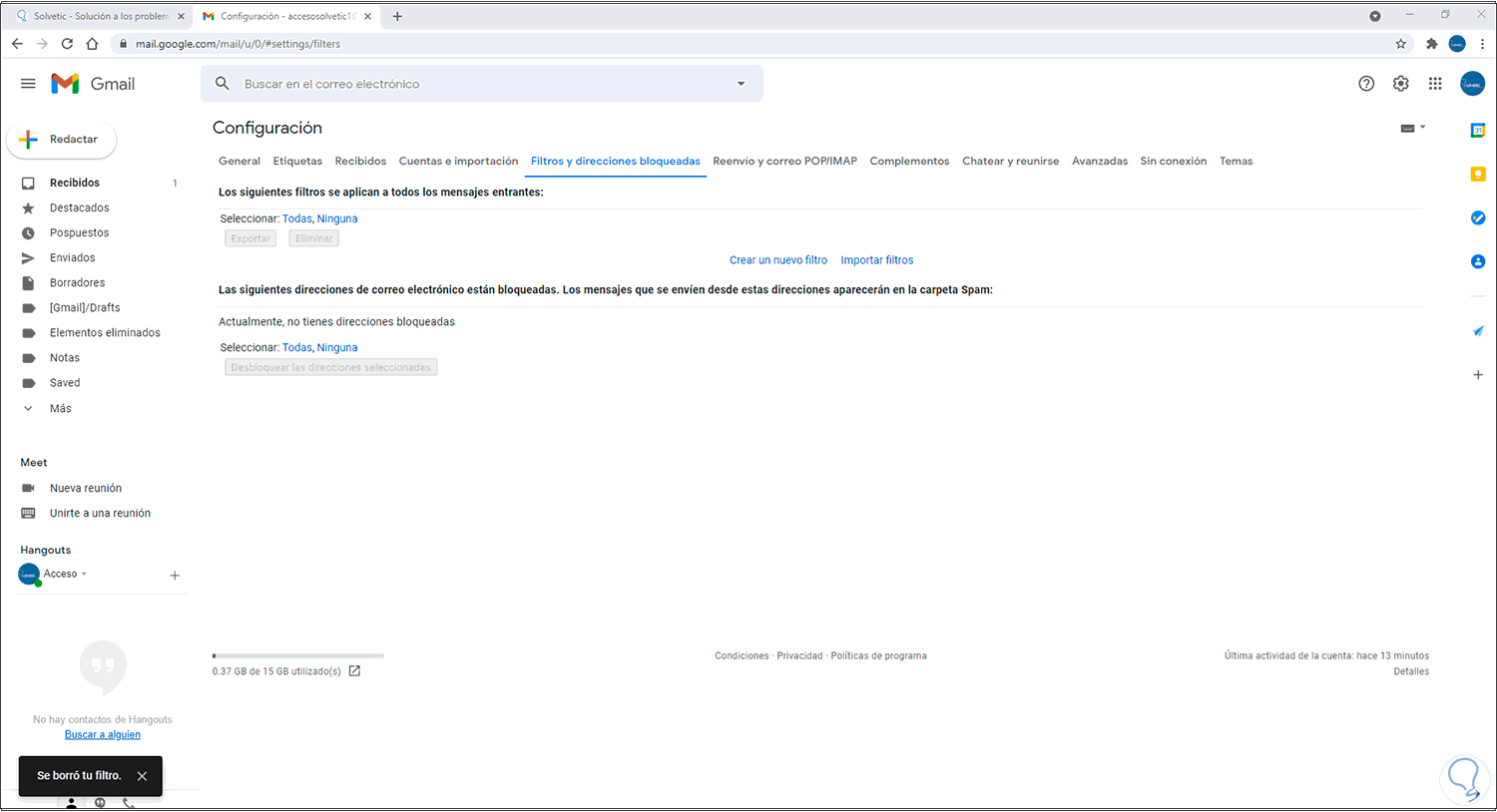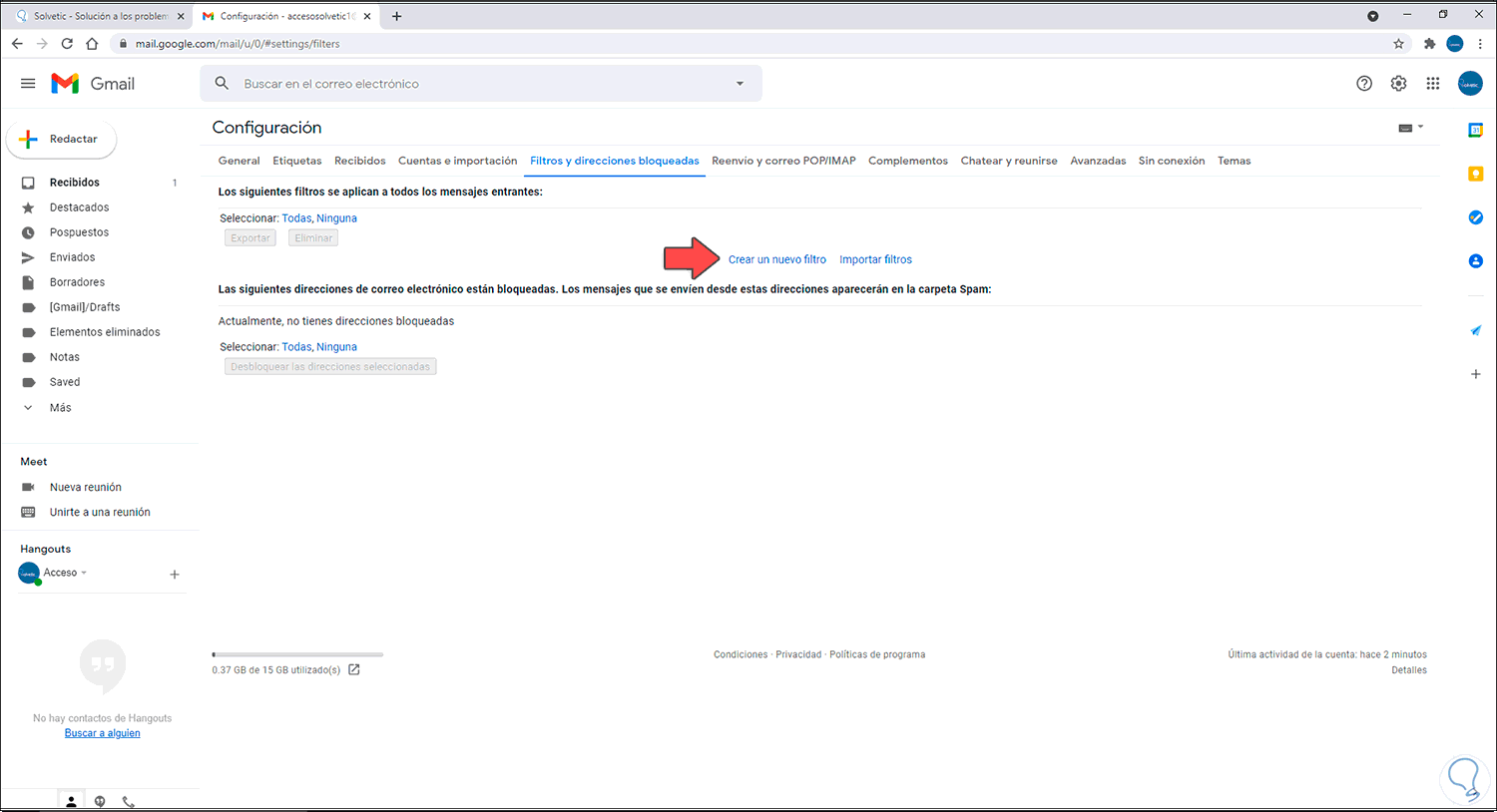 En la ventana desplegada vamos a la sección "Filtros y direcciones bloqueadas", veremos lo siguiente: