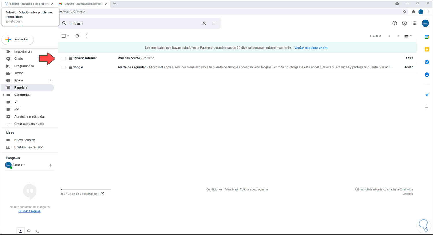 Ahora si vamos a la carpeta correspondiente, en este caso Spam, veremos ahí el correo y el remitente bloqueado