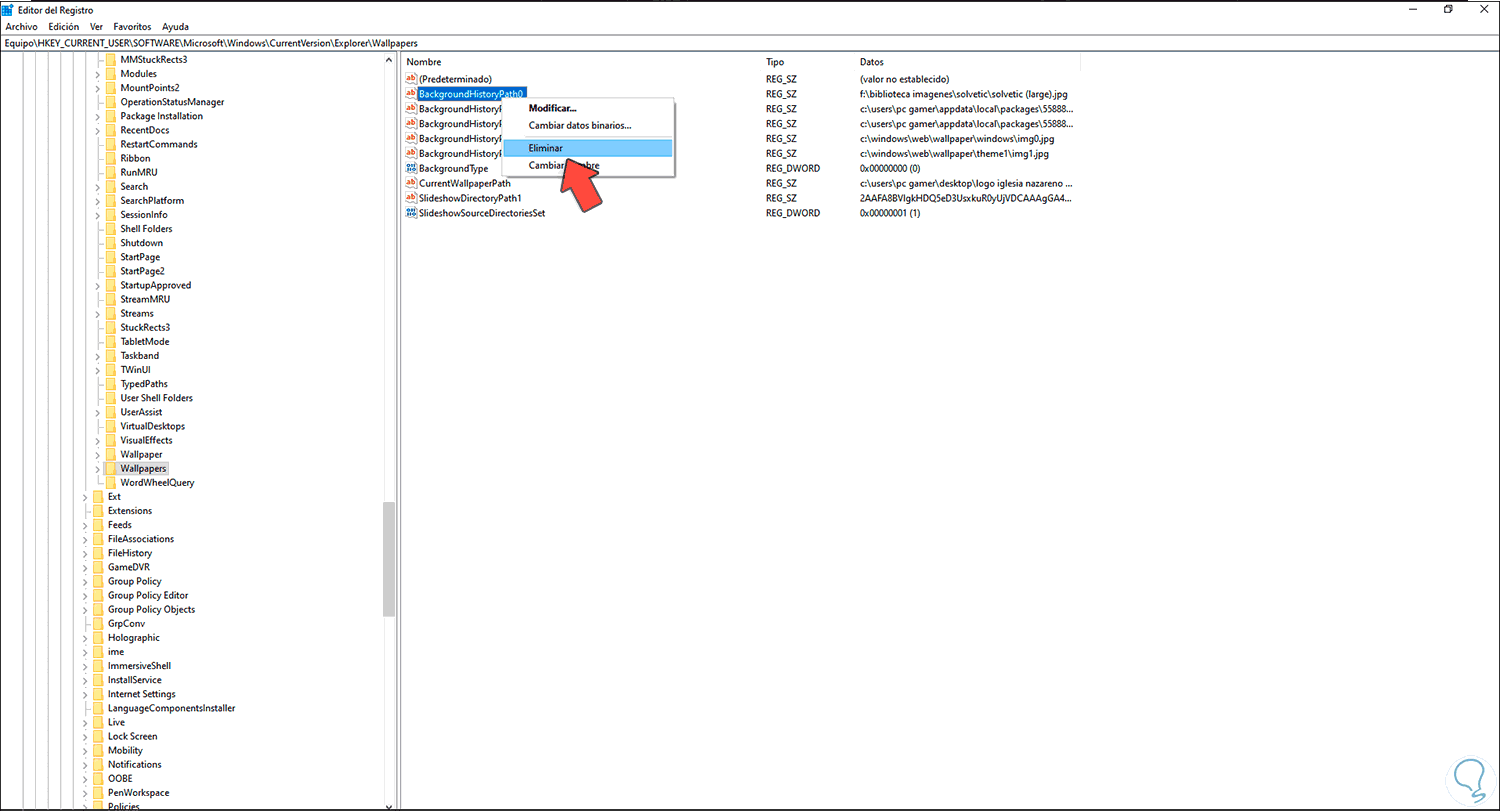 En el panel central veremos los fondos de pantalla que se han establecido en Windows 10 con la leyenda “BackgroundHistoryPath”, allí damos clic derecho sobre el fondo deseado a borrar y seleccionamos la opción Eliminar: