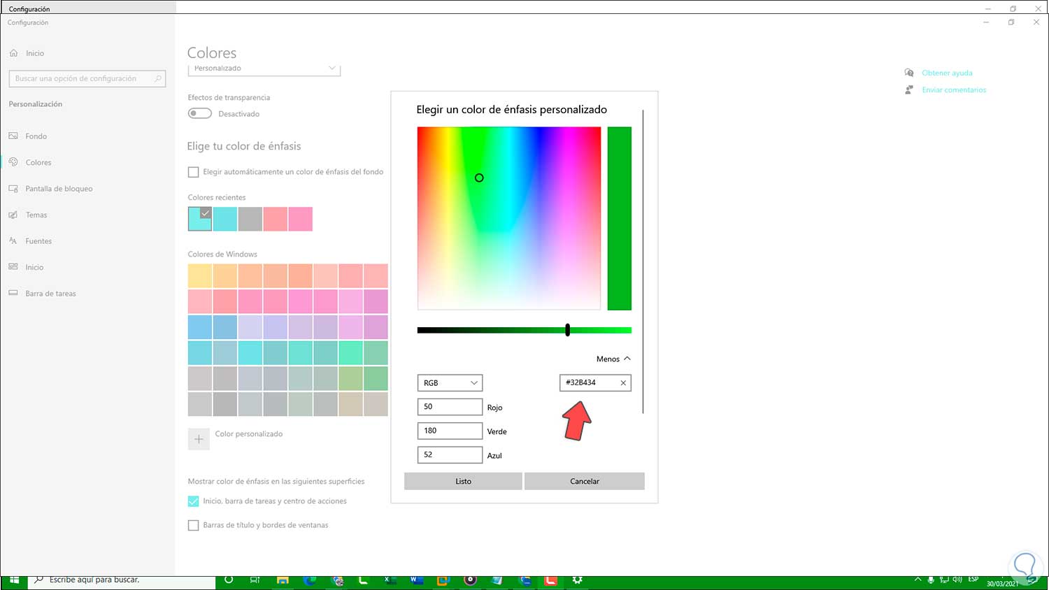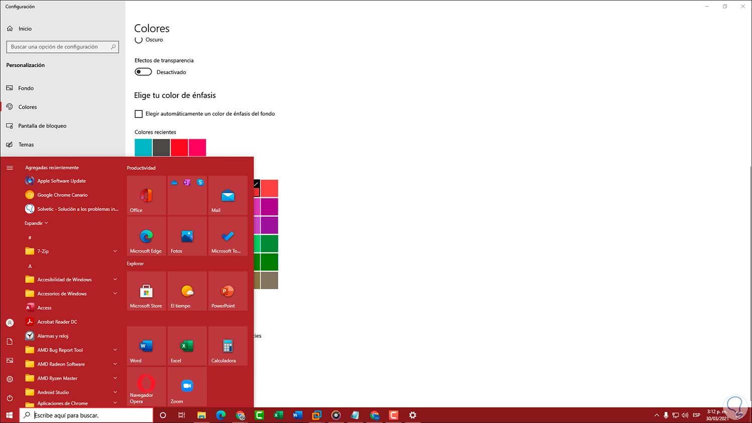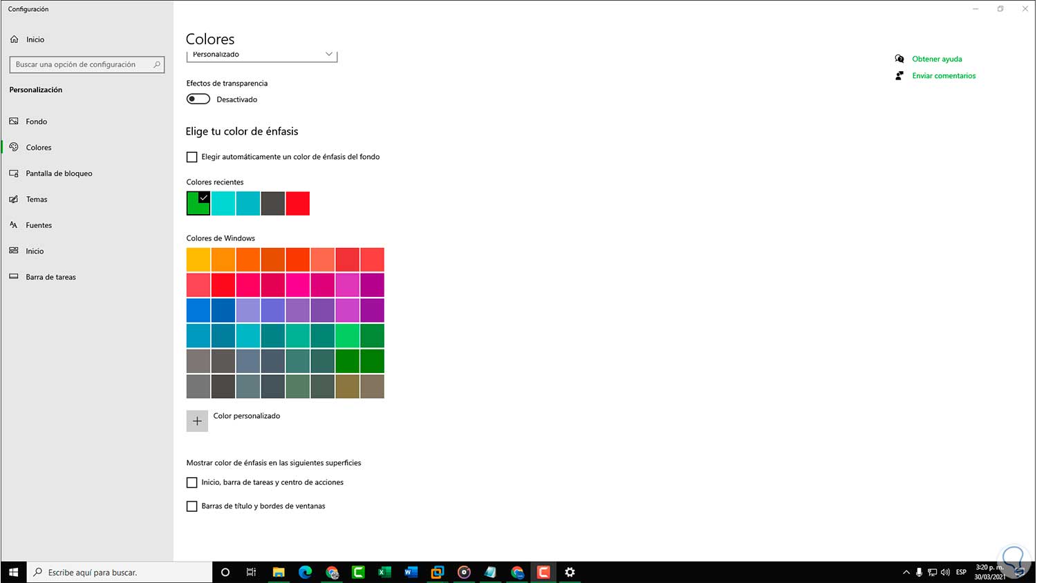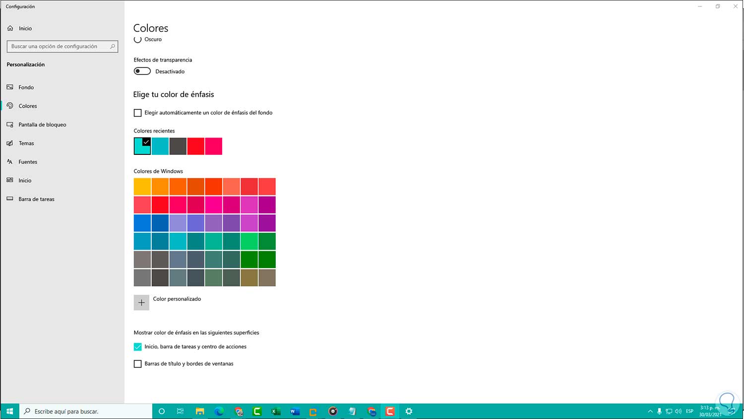 Este es el proceso para cambiar el color a la barra de tareas en Windows 10.