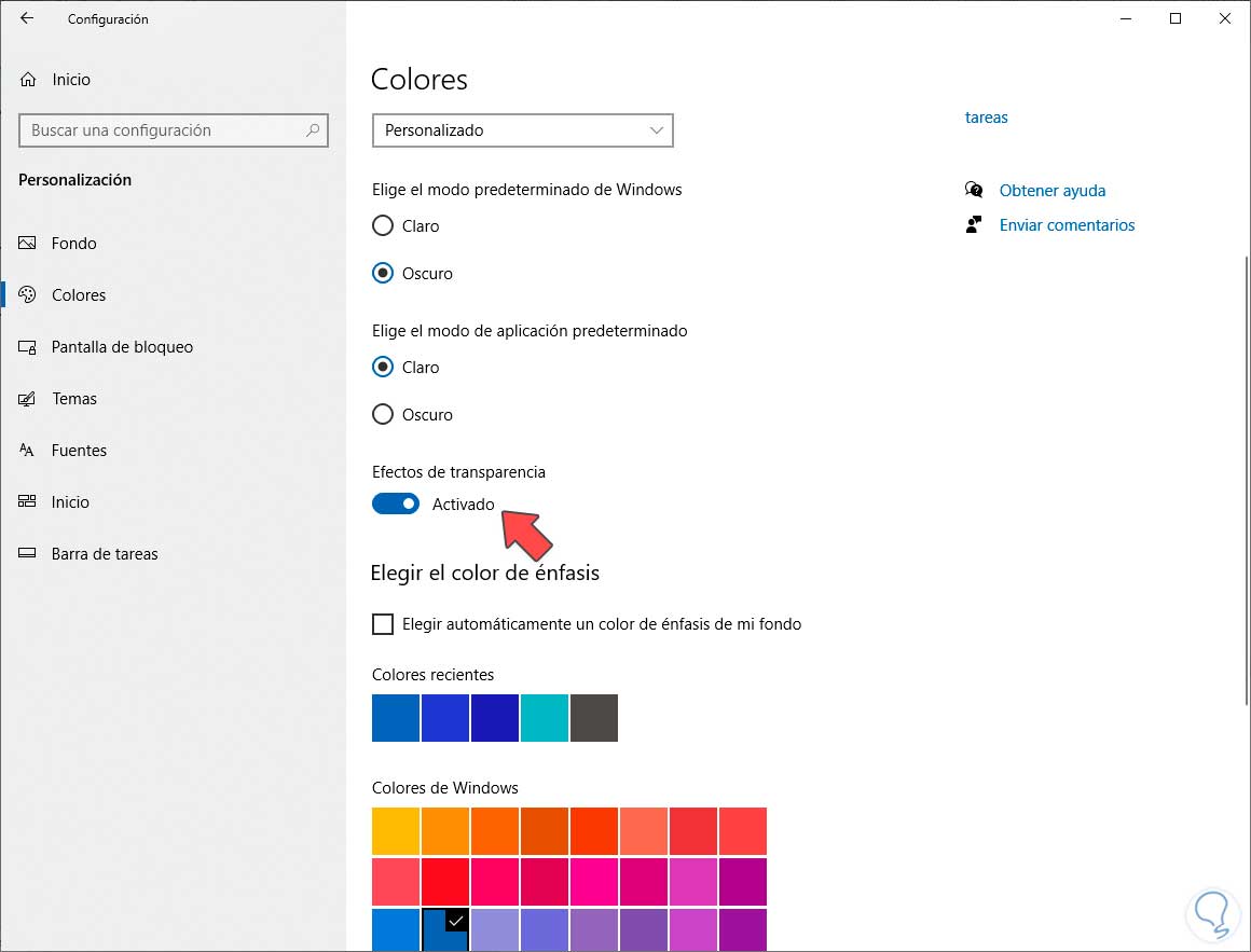- Valida que el interruptor "Efectos de transparencia" esté desactivado
