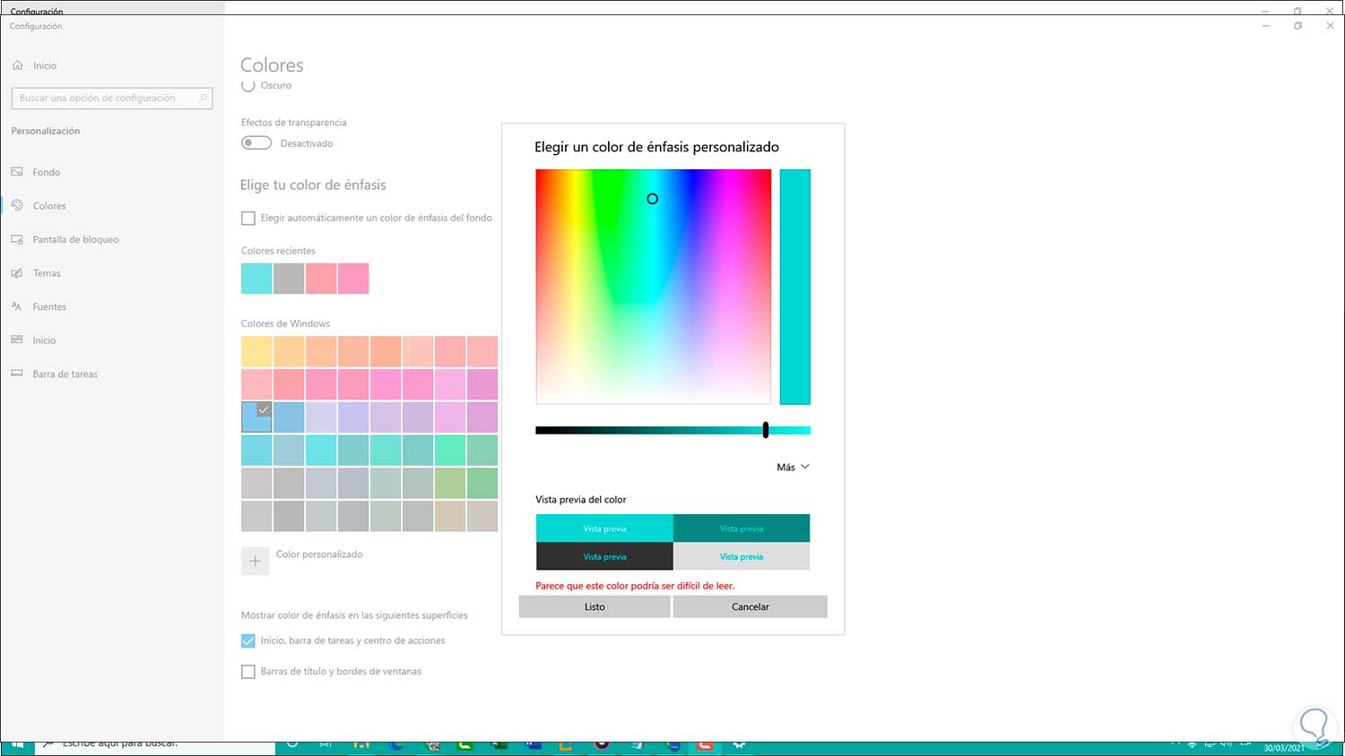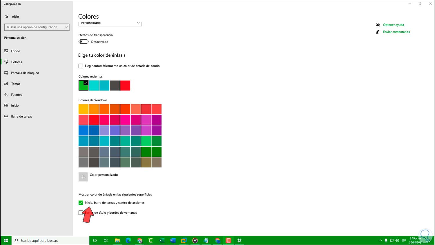 Ahora activamos la casilla "Inicio, barra de tareas y centro de acciones". Podemos ver el cambio inmediato en la barra de tareas, ahora seleccionamos los colores deseados en la paleta central, esto afectará barra y menús: