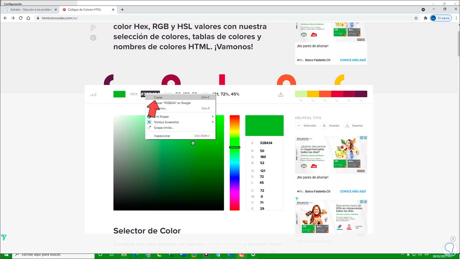 En la paleta seleccionamos en color deseado, copiamos el código hexadecimal: