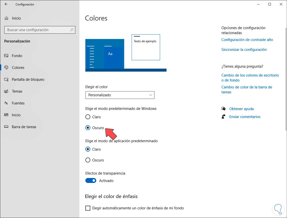 - En "Modo predeterminado de Windows" selecciona Oscuro