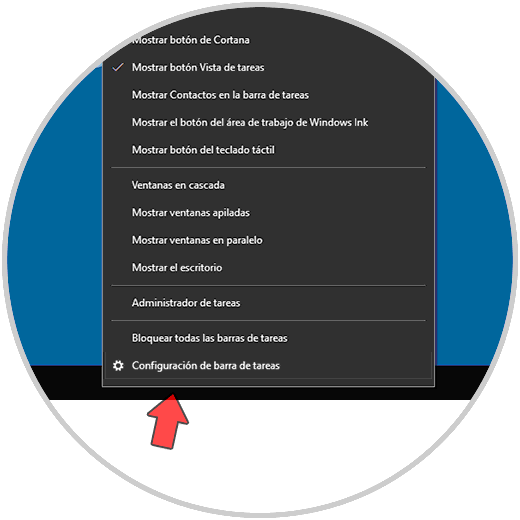 Damos clic derecho sobre la barra de tareas y seleccionamos la opción "Configuración de barra de tareas":