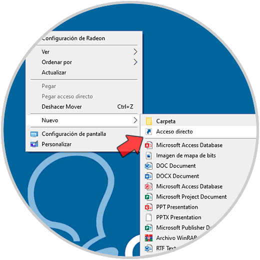 Damos clic derecho en el escritorio en algún lugar libre y seleccionamos "Nuevo - Acceso directo":