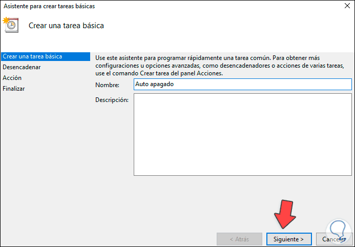 Damos clic en "Crear tarea básica" y en el asistente desplegado en primer lugar ingresamos el nombre de la tarea a crear: