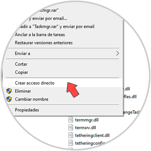 Para usar este método vamos a la ruta "C:\Windows\System32", allí damos clic derecho sobre taskmgr y seleccionamos la opción "Crear acceso directo":