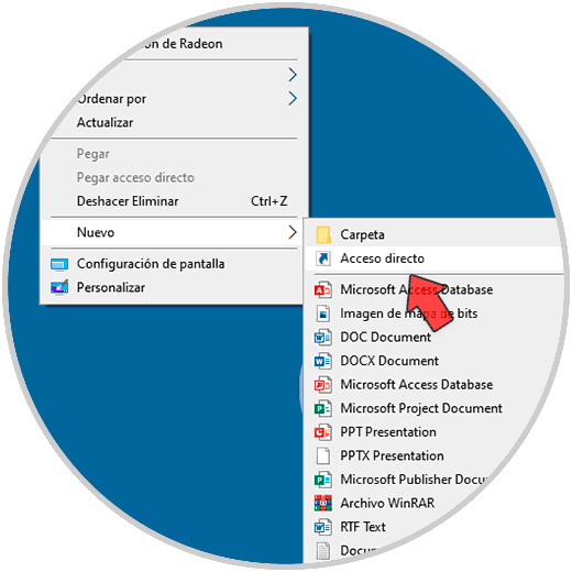 Para este proceso damos clic derecho en el escritorio y allí selecciona "Nuevo - acceso directo":