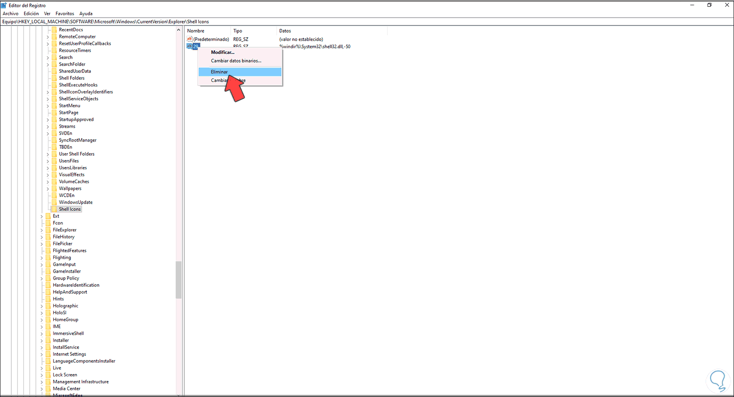Para restaurarlas abre el editor y elimina el valor de cadena 29 dando clic derecho sobre él y seleccionando “Eliminar”: