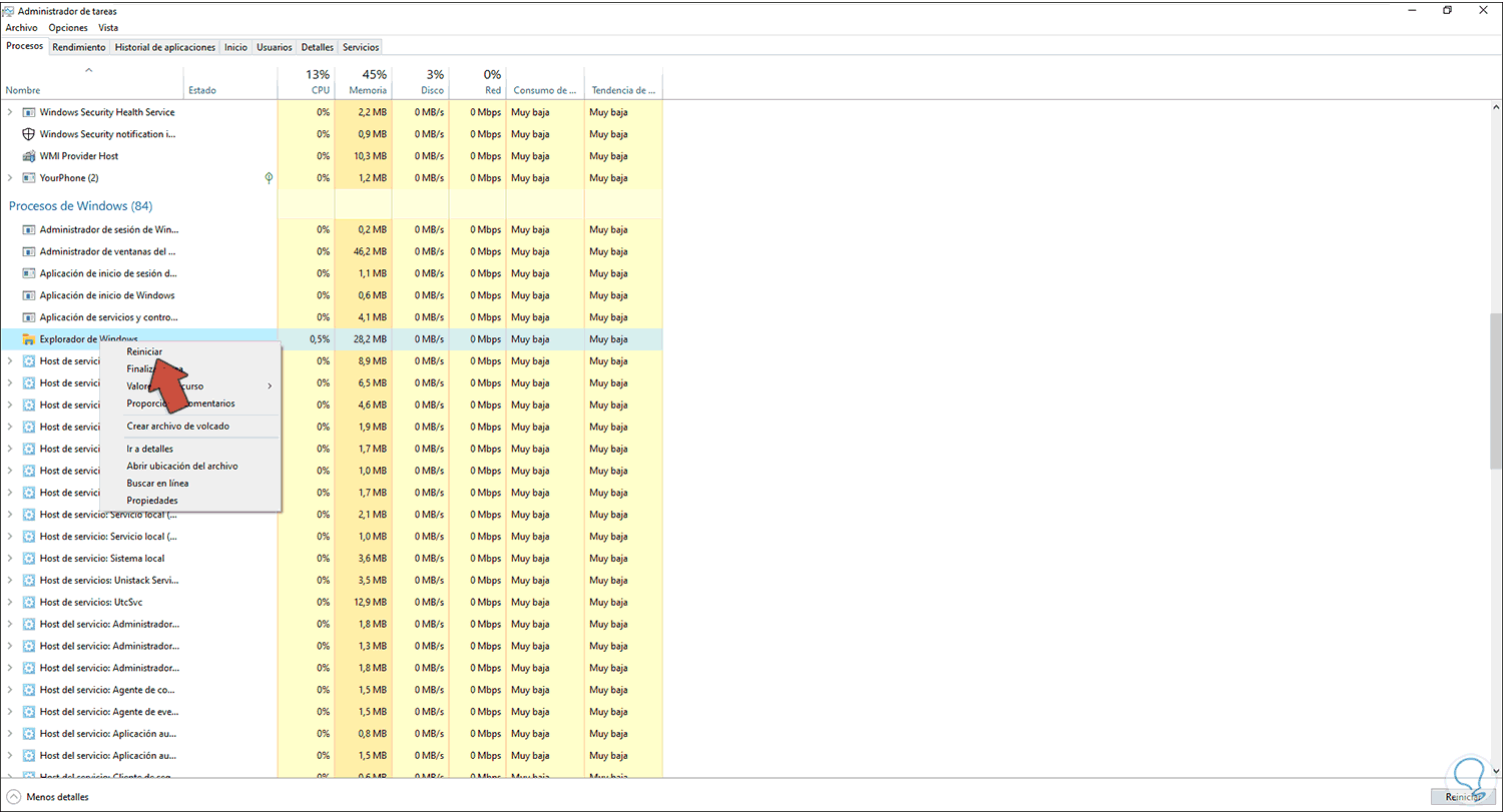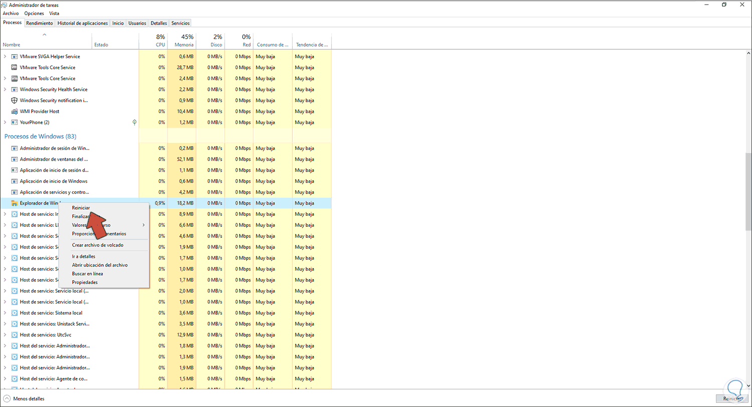 - Dando clic derecho sobre el Explorador y seleccionar Reiniciar