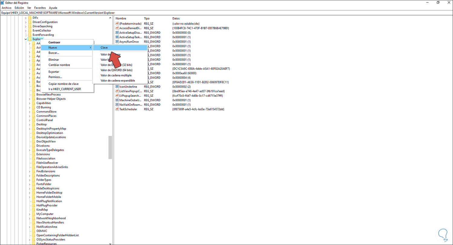 Allí vamos a dar clic derecho sobre la clave Explorer y en el menú desplegado seleccionamos "Nuevo - Clave":