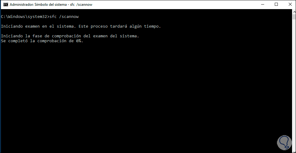 En la consola vamos a realizar un escaneo al sistema de archivos de Windows 10 para determinar si el error se da desde allí, para esto ejecutamos el comando: