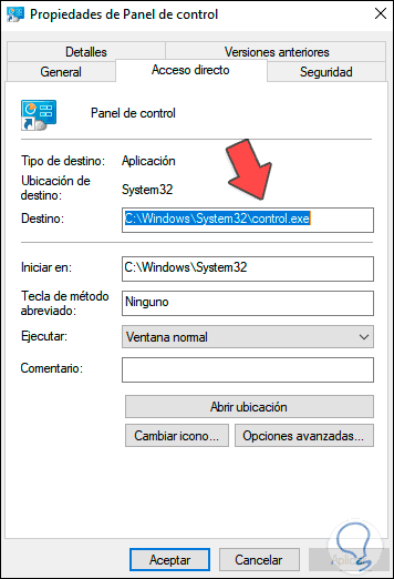 En la ventana emergente ingresamos "C:\Windows\System32\control.exe":
