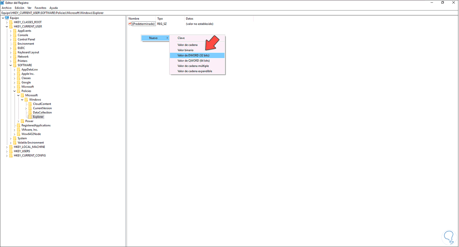 Ahora damos clic derecho en algún lugar libre y seleccionamos "Nuevo - Valor de DWORD (32 bits)":