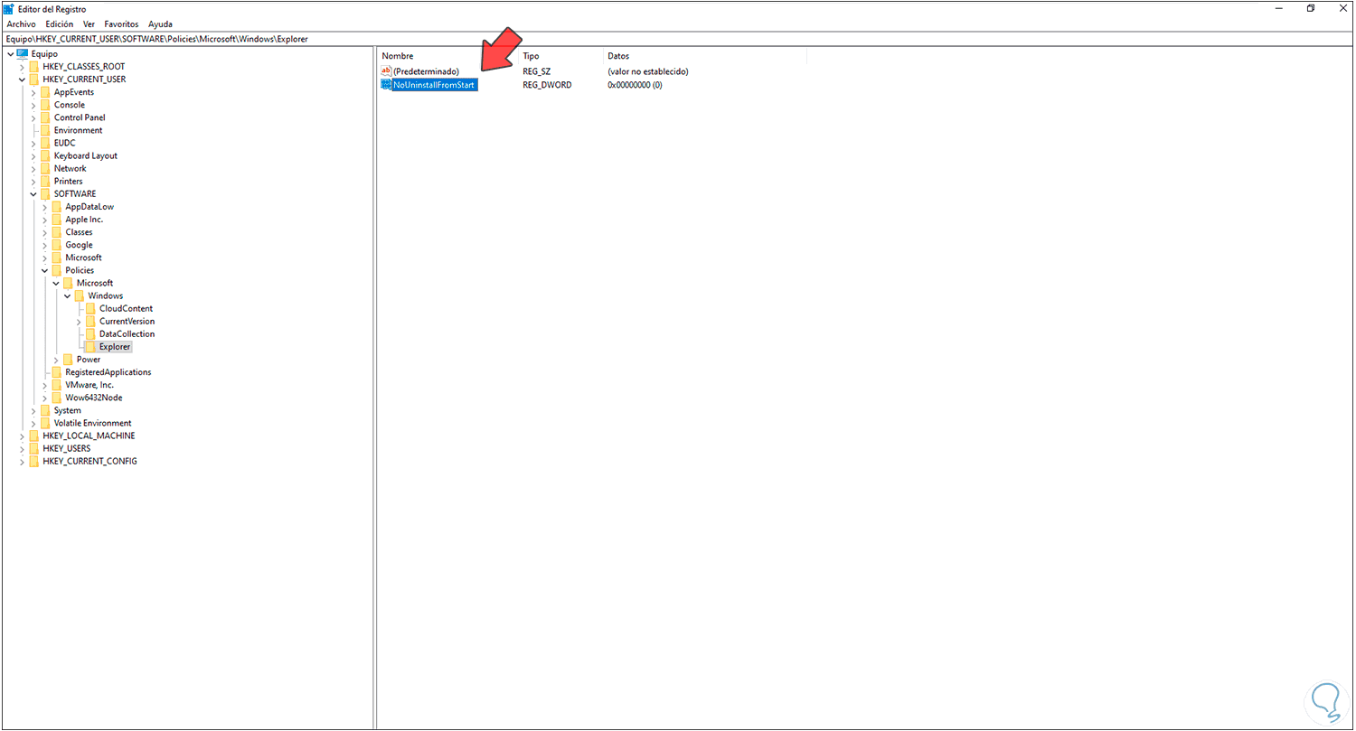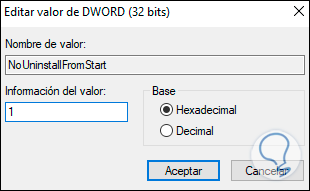 A este valor lo llamaremos "NoUninstallFromStart", aplicamos los cambios: