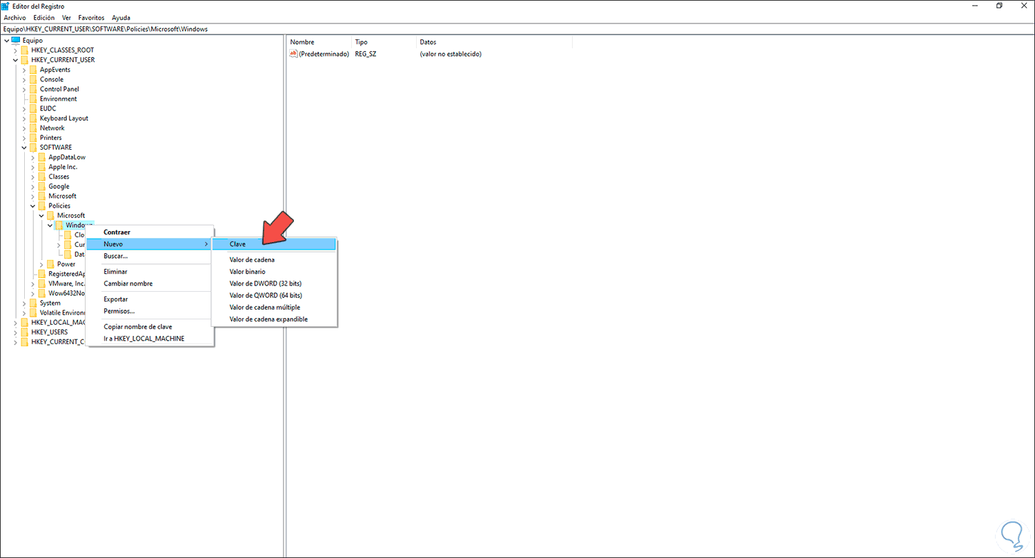 Allí damos clic derecho sobre la clave Windows y seleccionamos "Nuevo - Clave":