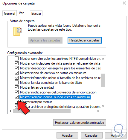 En la ventana emergente que será desplegada, iremos a la sección ver ay allí activamos la casilla "Mostrar siempre íconos, nunca vistas en miniatura" la cual por defecto esta deshabilitada. Aplicamos los cambios.