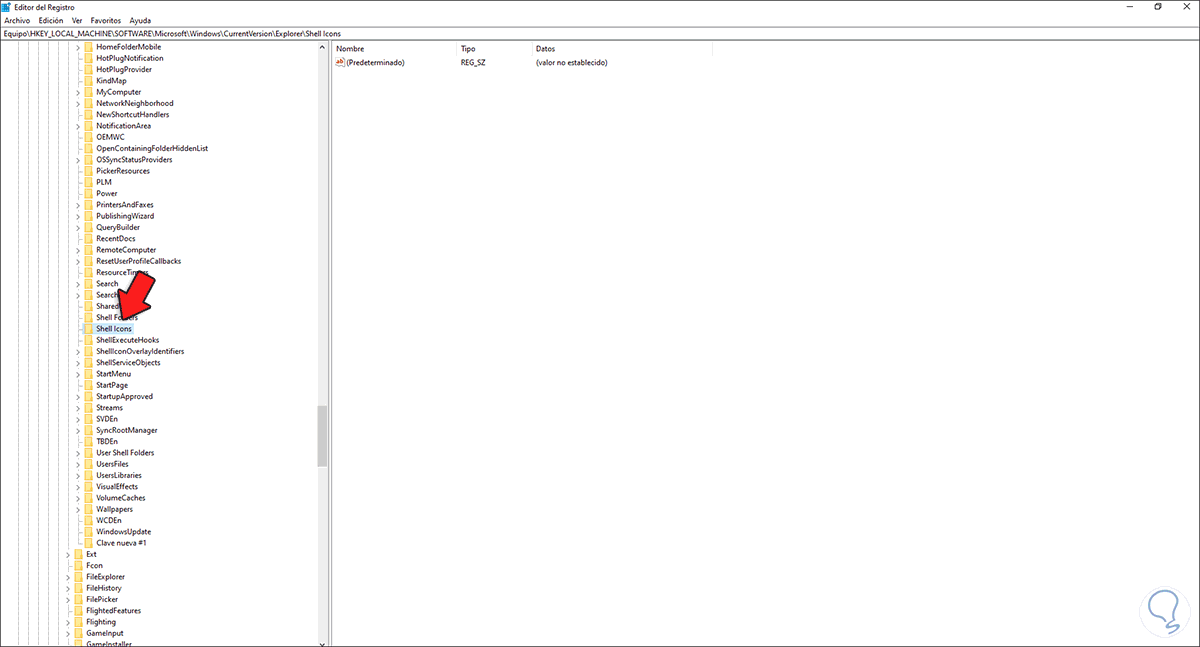 HKEY_LOCAL_MACHINE\SOFTWARE\Microsoft\Windows\CurrentVersion\Explorer – Shell IconsNota: En caso de que Shell Icons no esté disponible vamos a dar clic derecho sobre Explorer y seleccionamos “Nuevo – Clave”: