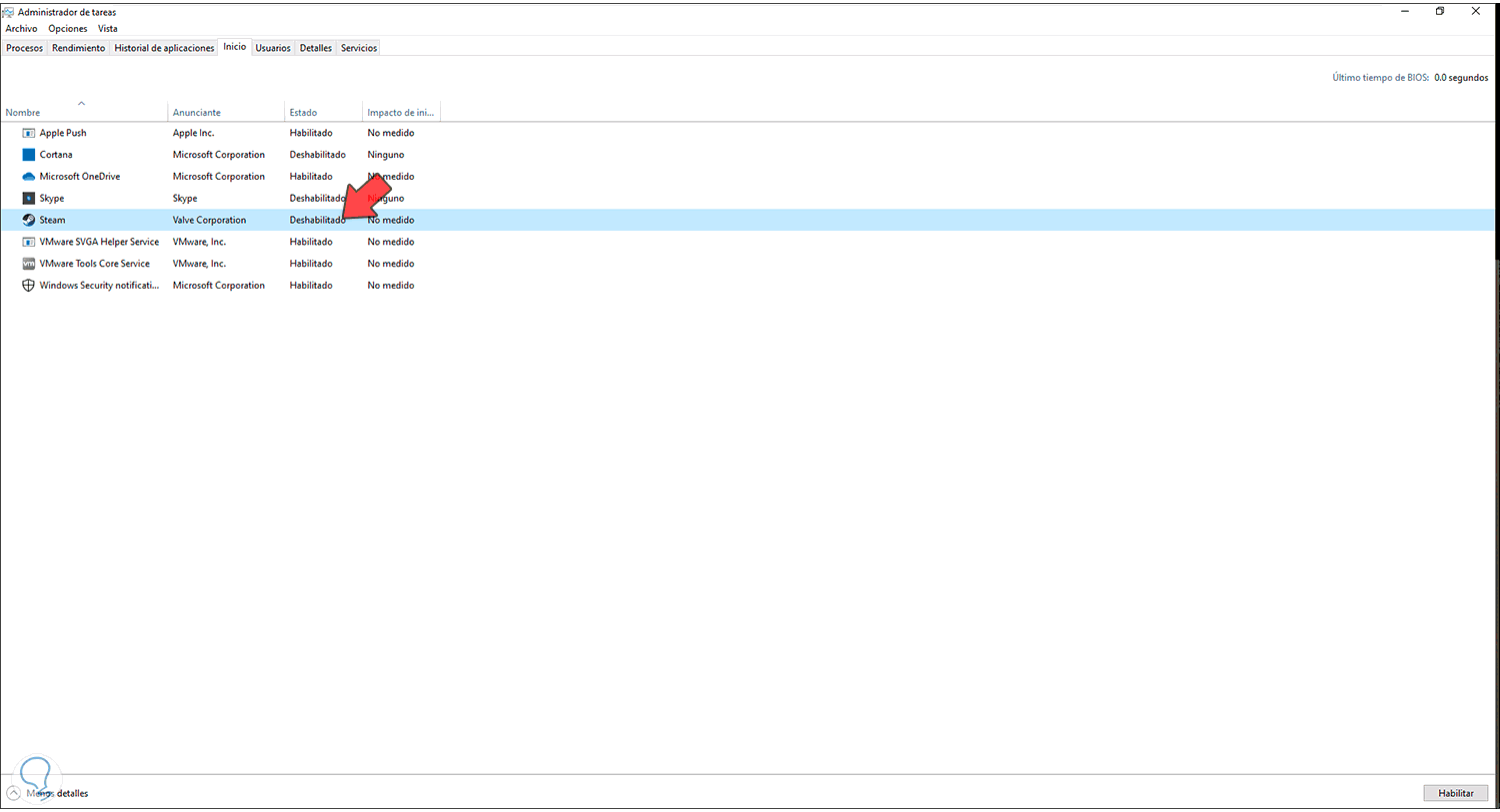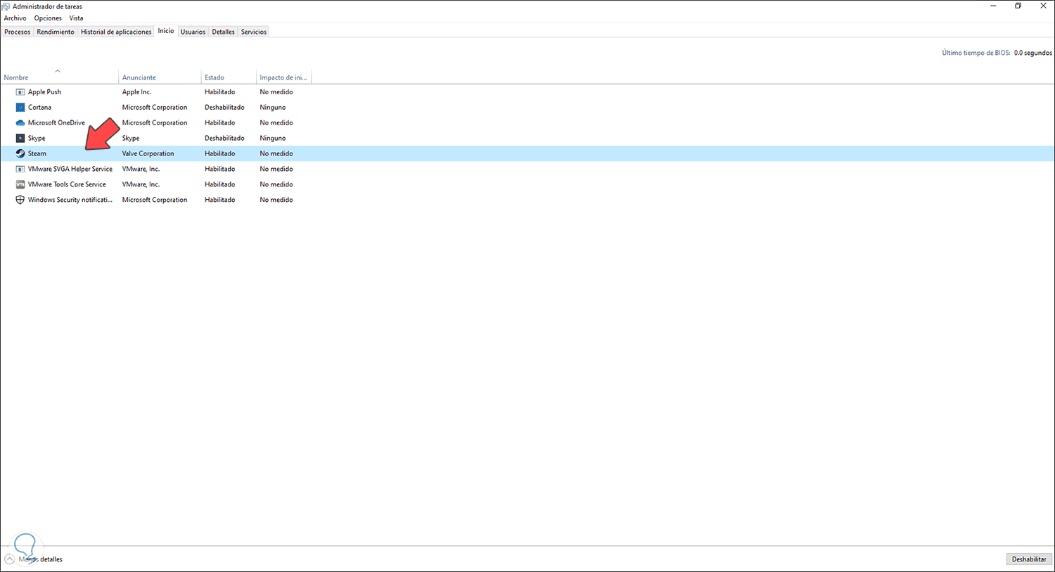 Ahora vemos que Steam ha sido deshabilitado y con esto no será posible que se abra junto a Windows 10 al iniciar sesión: