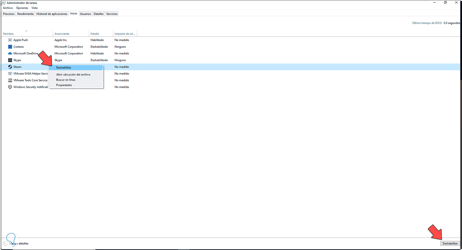 - Dando clic derecho sobre Steam y seleccionamos "Deshabilitar"