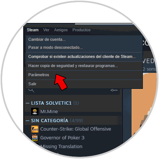 Para este primer método abrimos Steam, luego vamos al menú "Steam - Parámetros":